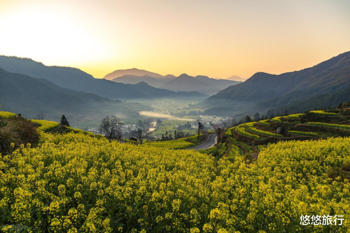2月下旬,江岭村的梯田的油菜花依然蓄势待发,漫天遍地的油菜由绿过渡到黄。