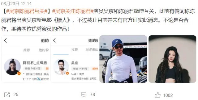 当“网传镖东说念主女主换陈丽君补拍”引起热议的时刻,网友们发现一件事情,那即是吴京护理陈丽君,咱们皆知说念,网上传出的大部分音信,皆是有迹可循的,如今吴京护理陈丽君,两边是否照旧达成配合意向了呢?很有可能是补拍完成后,官方再进行官宣。
