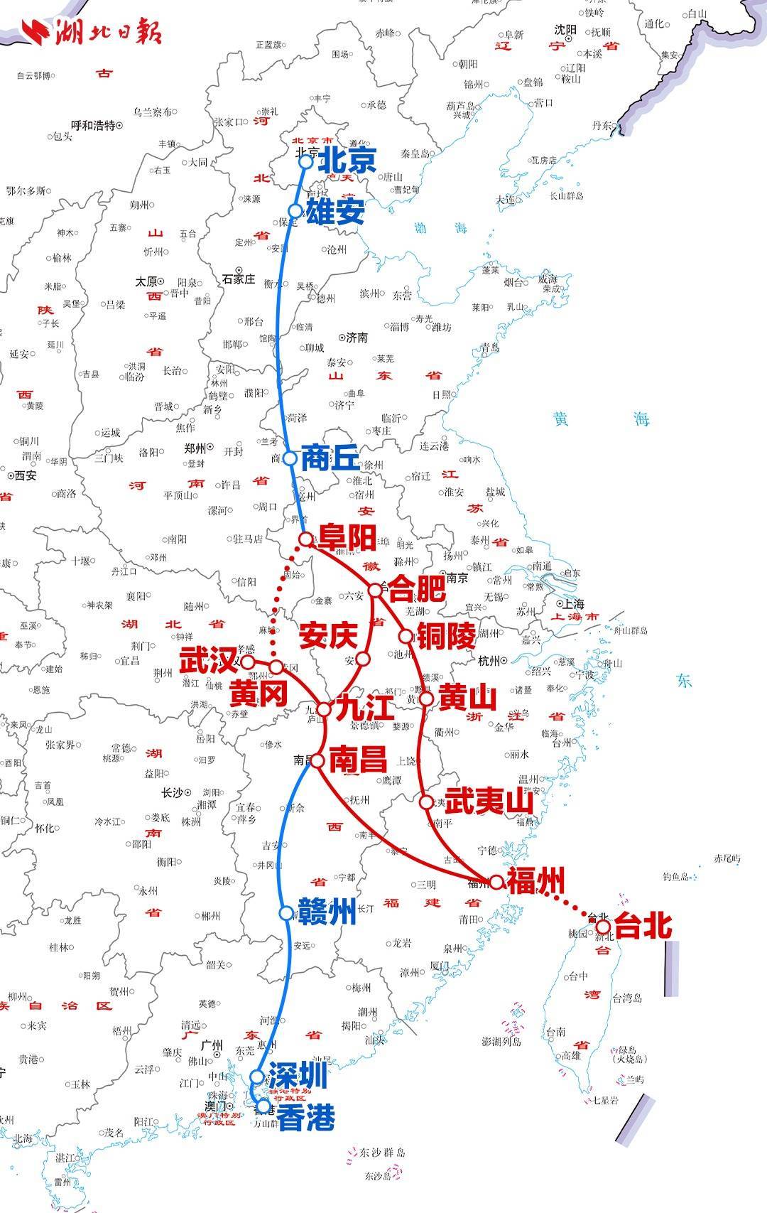 这意味着,已往京港(台)高铁全线清爽后,从台北启航经福州、合肥、黄冈等地,可到达武汉。此外,武汉可借助福银通谈经九江、南昌、福州,通往台北。